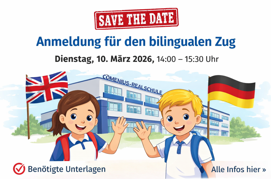 Am Dienstag, 10. März 2026, findet die persönliche Anmeldung für den bilingualen Zug an der Comenius-Realschule statt. Alle wichtigen Informationen zu Uhrzeit und benötigten Unterlagen finden Sie hier.