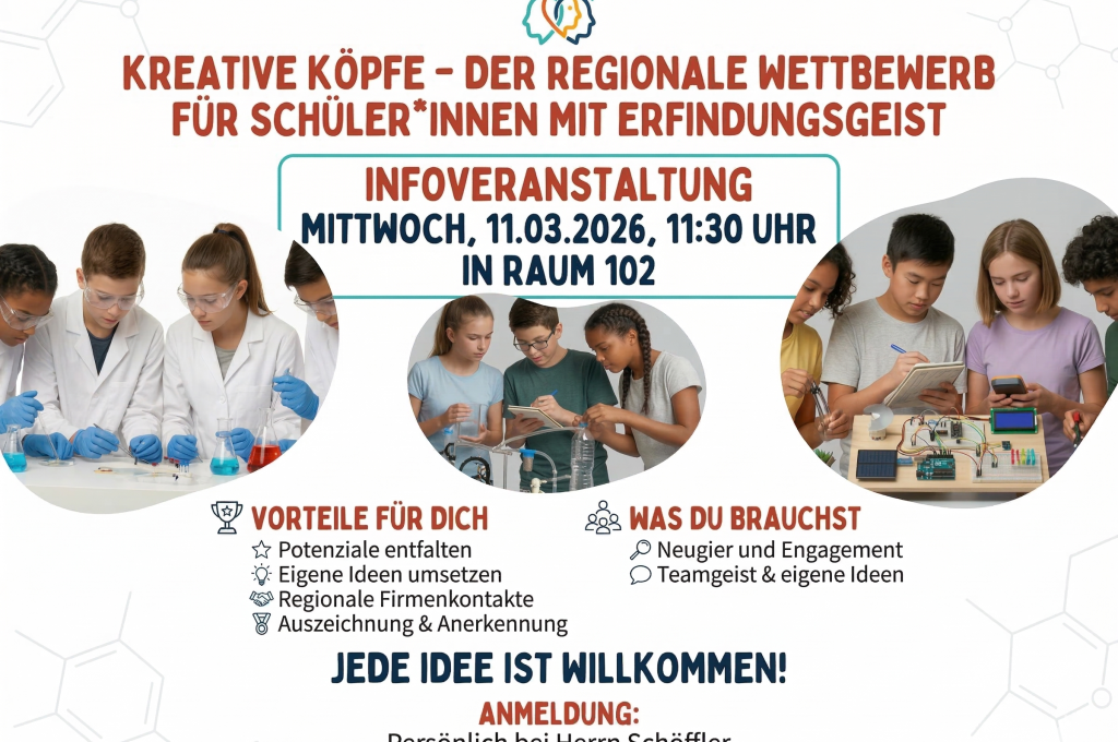 Infoveranstaltung für alle Schüler*innen mit Ideen: Mittwoch, 11.03.2026, um 11:30 Uhr in Raum 102. Entfalte dein Potenzial, knüpfe Kontakte zu Firmen und melde dich bei Herrn Schöffler an.