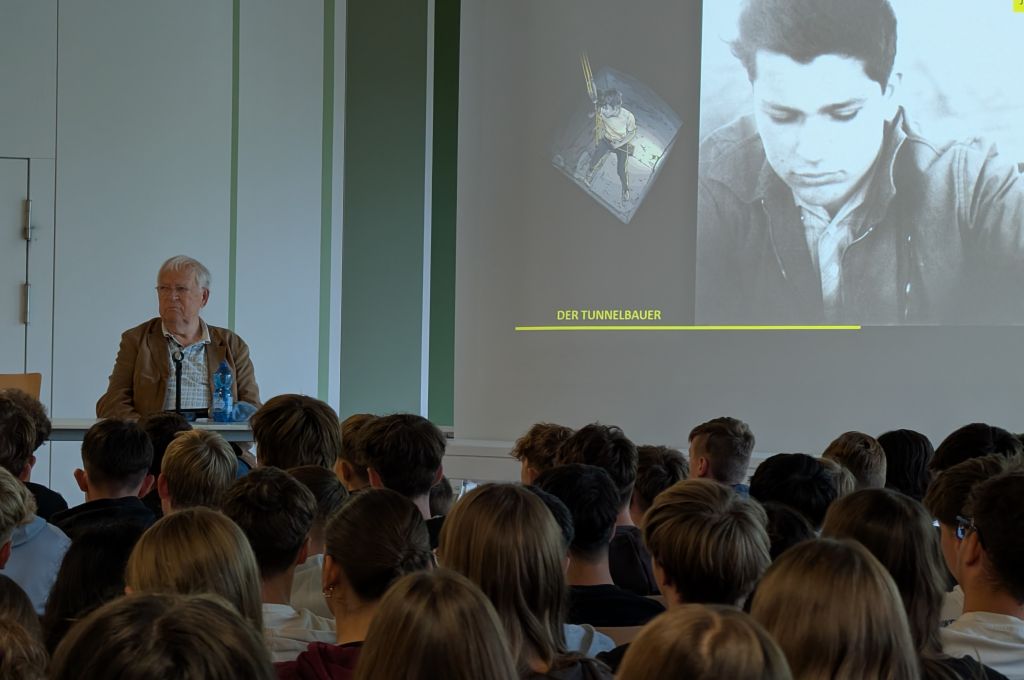 Ein bewegender Abend am 23. September in der Aula der Comenius-Realschule: Autorin Maja Nielsen und Zeitzeuge Joachim Neumann erzählten von Mut, Hoffnung und Liebe in Zeiten der Berliner Mauer. Schülerinnen und Schüler sowie Gäste aus Wertheim waren dabei.