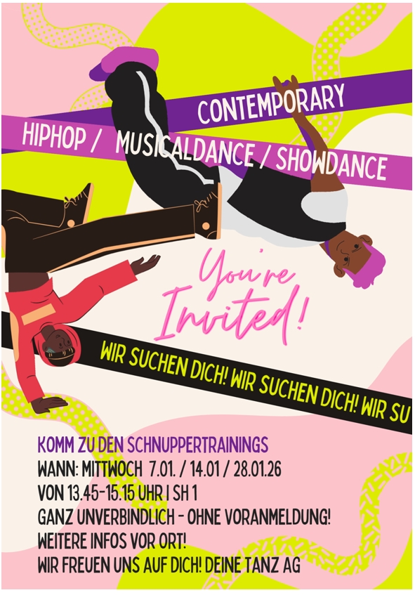 Bist du bereit, das neue Jahr mit Rhythmus zu beginnen? Die Tanz AG der Comenius-Realschule öffnet wieder ihre Türen und lädt alle Tanzbegeisterten (und die, die es werden wollen) herzlich ein!