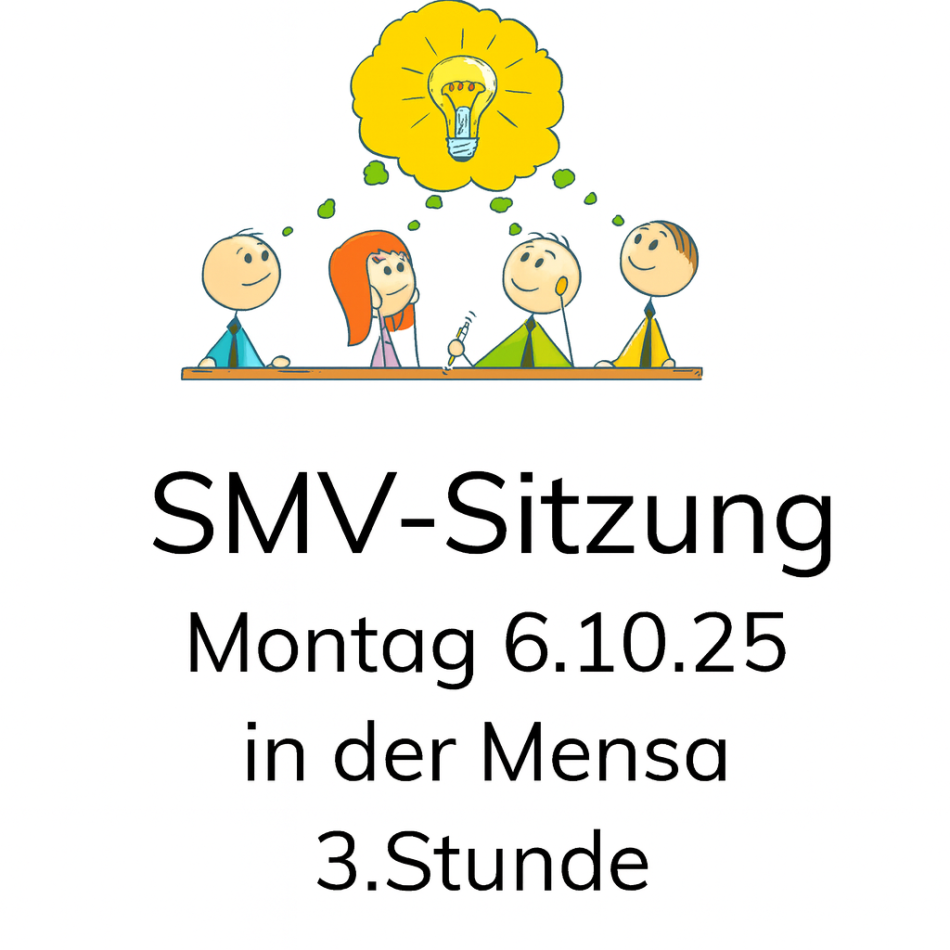 Am Montag, den 6. Oktober 2025, findet die erste SMV-Sitzung des Schuljahres statt. Eingeladen sind alle Klassensprecherinnen und Klassensprecher sowie deren Stellvertreterinnen und Stellvertreter. Treffpunkt ist die Mensa in der 3. Stunde.
