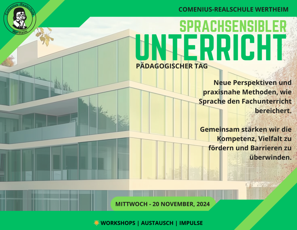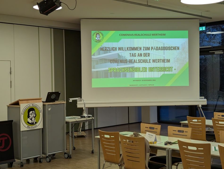 Am 20. November 2024 widmete sich die Comenius-Realschule Wertheim einem besonders wichtigen Thema: Sprachsensibler Unterricht. Im Rahmen eines Pädagogischen Tages trafen sich Lehrkräfte der Schule sowie Gäste von benachbarten Schulen wie dem Dietrich-Bonhoeffer-Gymnasium Wertheim und dem Schulzentrum am Wört in Tauberbischofsheim, um gemeinsam an innovativen Ansätzen zu arbeiten, wie Sprache gezielt den Fachunterricht bereichern kann.