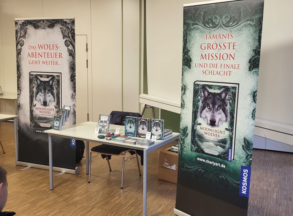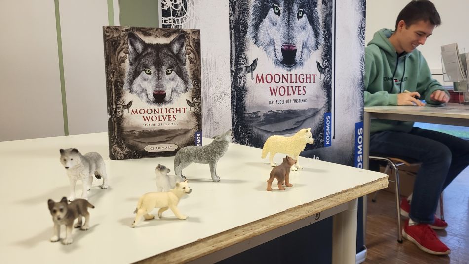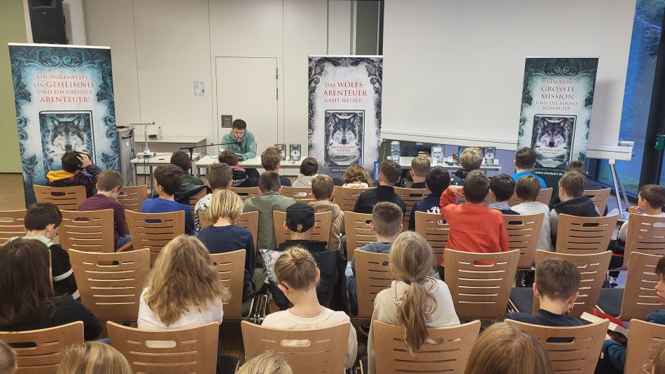 In zwei Durchläufen entführte Charly die knapp 140 Schülerinnen und Schüler mit ihren Lehrkräften in die Welt des Wolfswelpen Tamani, der mit seinem Rudel Abenteuer im Wächtergebirge bestehen muss und aus dessen Sicht die Geschichte geschrieben wurde. Nachdem Charly Teile des ersten Buchs vorgelesen hatte, blieb noch Zeit für die vielen Fragen der Schülerinnen und Schüler, die sie sich im Vorfeld überlegt hatten. Alle waren sehr interessiert daran, wie das Leben als junger Autor so ist, wie viel Charly Art durch den Verkauf der Bücher verdient und woher er seine Ideen für die Bücher hat. Neben dem Schreiben mache er derzeit das Abitur, von zu Hause aus, was seiner Tätigkeit als Autor zu Gute kommt. Momentan könne er noch nicht von den Verkäufen leben, an einem verkauften Buch verdiene er lediglich 60 Cent. Nach seinen Angaben schaffen es Autoren meist, wenn Bücher in andere Sprache übersetzt würden. Ideen für seine Bücher liefere ihm vor allem die Natur, die unterschiedlichen Landschaften, aber auch von Bildern und Musik lasse er sich inspirieren. Die Frage, ob er schon einmal eine Schreibblockade hatte, beantwortete er mit einem klaren Ja. Das komme schon vor, insbesondere wenn Abgabetermine anstehen. Da helfe es ihm immer, einen Puffer einzuplanen, um Manuskripte rechtzeitig abgeben zu können. Wie er mit Kritik umgehe und ob er Angst davor habe, interessierte die Schülerinnen und Schüler auch. Anfangs habe er sich mehr daraus gemacht, heute könne er gut damit umgehen, weil er genau filtert, ob die Kritik sinnvoll oder nicht ist. Charly beantwortete diese und weitere Fragen, die unsere Fünftklässler gestellt hatten geduldig und ausführlich und so konnten wir alle spannende Einblicke in das Leben und das Arbeiten des jungen Autors gewinnen.