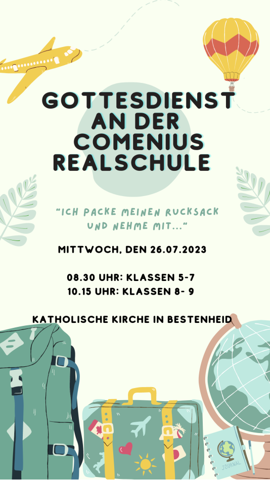 GOTTESDIENST AN DER COMENIUS REALSCHULE "ICH PACKE MEINEN RUCKSACK UND NEHME MIT..." MITTWOCH, DEN 26.07.2023 08.30 UHR: KLASSEN 5-7 10.15 UHR: KLASSEN 8-9 KATHOLISCHE KIRCHE IN BESTENHEID JOURNAL
