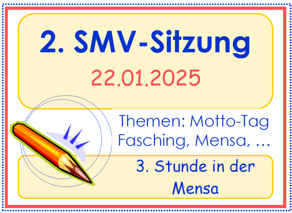 die SMV lädt euch herzlich zur 2. SMV-Sitzung am 22. Januar 2025 ein. In der 3. Stunde treffen wir uns in der Mensa, um gemeinsam wichtige Themen für die Schulgemeinschaft zu besprechen.