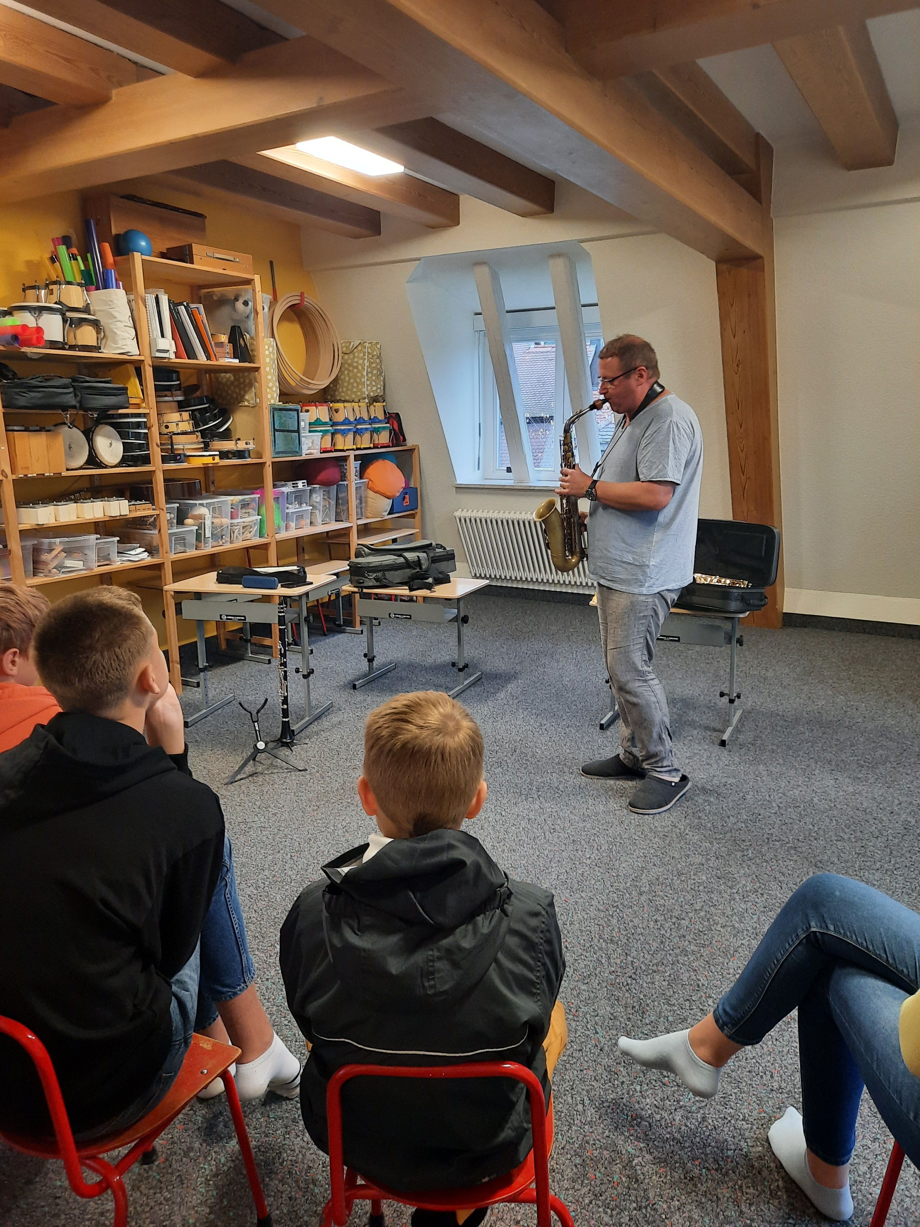 Musikschulleiter Stefan Blido hatte einen Instrumentenzirkel organsiert, bei dem die 26 Schülerinnen und Schüler der Klasse verschiedene Instrumente kennen lernen durften – und dabei nicht nur zuschauen und zuhören, sondern selbst musizieren.