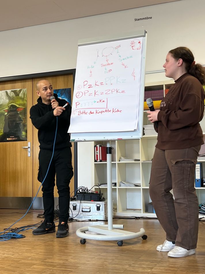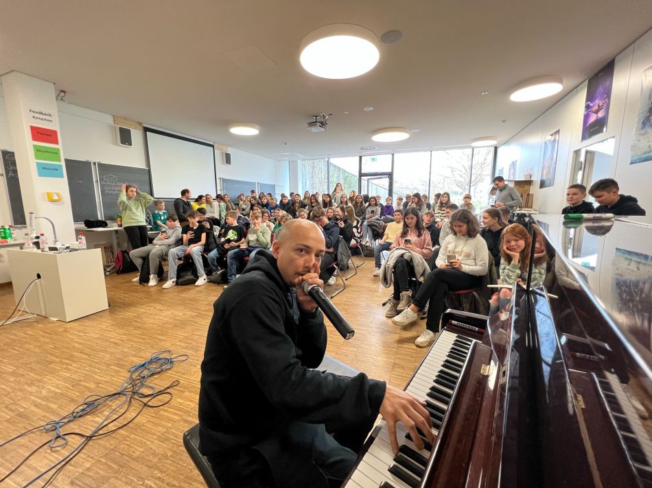 Am Montag, den 13.03.23, hatten die Klassen 7a, 7b und 7s das große Los gezogen und konnten ihr Beatbox-Talent entdecken und gleich unter Beweis stellen. Der Europameister im Beatboxen Robeat alias Robert Wolf zeigte den Schülerinnen und Schülern in einem einstündigen Kurs, mit welchen Tricks man unterschiedliche Töne und Geräusche allein mit seinem Mund erzeugen kann. Dabei konnte man das Gelernte gleich am Mikrofon ausprobieren. Auch die Gesangstalente und Klavierkünste der SchülerInnen wurden aktiv miteinbezogen. Am Nachmittag präsentierte Robeat dann den Klassen sein Können und gab danach den begeisterten Schülerinnen und Schülern fleißig Autogramme und stand für gemeinsame Fotos zur Verfügung.