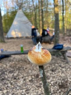 Abends angekommen erwartete die Klassen bereits zwei angeschürte Lagerfeuer und vorbereitetes Essen: Stockbrot, Schweine- und Rindswürste, Salate – klassisches Lagerfeueressen eben! Nach einer kurzen Einweisung, wie man Stockbrotteig richtig um einen Stock wickelt und über die Glut hält, stärkten sich die Schüler*innen nach einem langen Tag.