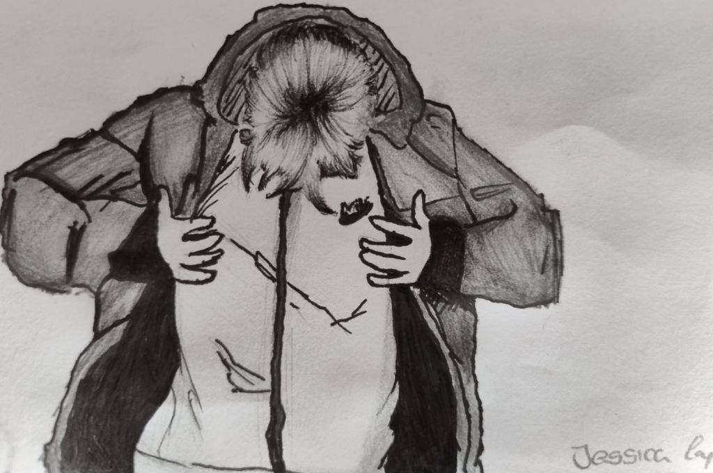 Jessica Caputa aus der Klasse 6b zeigt in ihrer Zeichnung eindrucksvoll, wie Ausdruckskraft durch gezielte Schatten und Kontraste entsteht. Mit wenigen Strichen gelingt es ihr, Neugier und Geheimnis zu verbinden – ein Moment, in dem sich jemand gleichzeitig verbirgt und präsentiert.