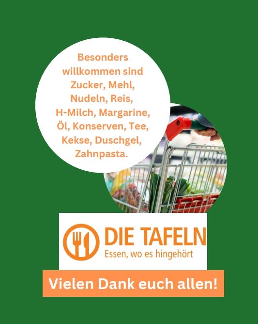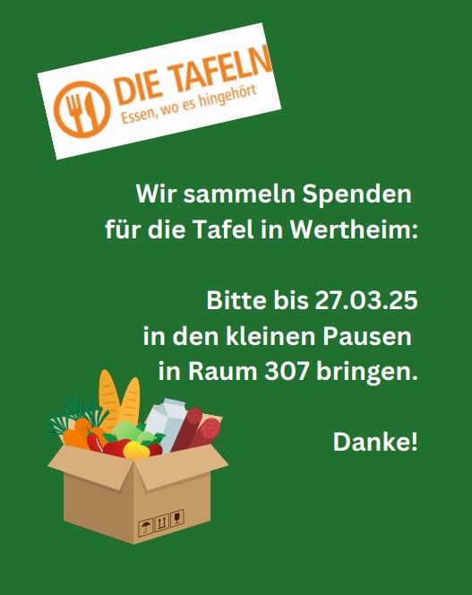 Unsere Schule engagiert sich erneut für die Tafel in Wertheim und sammelt dringend benötigte Lebensmittel und Hygieneartikel. Bis zum 27.03.25 können alle Spenden während der kleinen Pausen in Raum 307 abgegeben werden. Besonders gefragt sind haltbare Produkte wie Zucker, Mehl, Nudeln, Reis, H-Milch, Margarine, Öl, Konserven, Tee, Kekse, aber auch Duschgel und Zahnpasta. Jeder Beitrag, ob groß oder klein, hilft mit, Menschen in unserer Region zu unterstützen und ein Zeichen der Solidarität zu setzen.