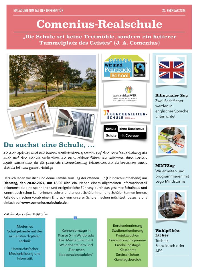 EInladung zum Tag der Offenen Tür - die Comenius-Realschule Wertheim stellt sich vor